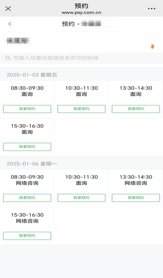 3. 选择咨询师和咨询时间:点击“咨询师列表”中的咨询师的名字→选择咨询时间段→填写“你现在最需要接受帮助的主要问题是什么?”和准确的手机号→点击“提交预约”(注意:必须提前一天预约,不接受当天预约)。