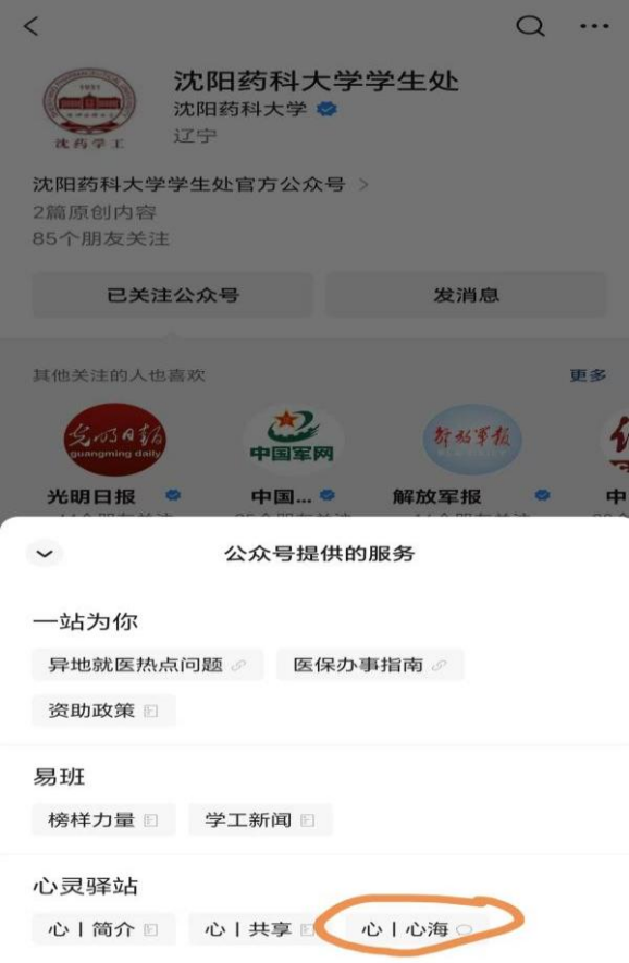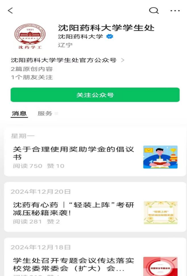 1.微信搜索“沈阳药科大学学生处”公众号,并点击“关注公众号”