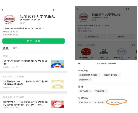 1.微信搜索“沈阳药科大学学生处”公众号,并点击“关注公众号”