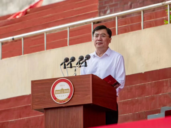 关雪峰代表学校向全体军训教官表示欢迎与感谢,并作军训动员讲话。他向参训学生提出三点要求:一要在军训中牢固树立保家卫国的国防意识,以饱满的热情和高昂的斗志投入训练;二要将军训作为磨练意志和锻造精神品质的宝贵机会,继承和发扬“马背上的药箱”精神,传承红色基因;三要努力学习人民军队铁的纪律和令行禁止的作风,培养团结协作的品格。他希望,青年学子在军训场上尽情挥洒青春的激情与汗水,在民族复兴的伟业中施展才华、建功立业。