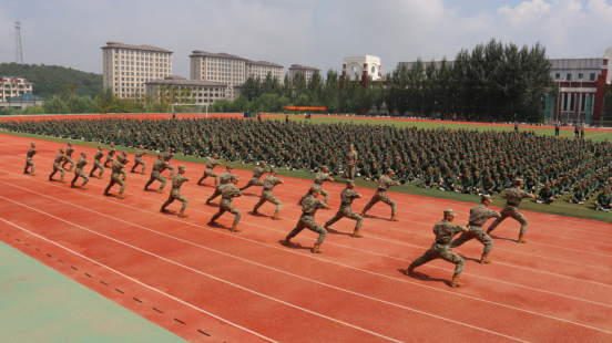 随后,全体军训教官进行了铿锵有力的军体拳表演,展现出新时代军人的铁血风采与过硬本领,为师生带来了最生动的国防教育课。